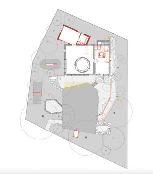 „Have You in My Wilderness“- Grundrisse aufskizzieren, 1:1 auf dem Grundstück, um sich mit dem Ort vertraut zu machen. Wir planen ein terrainbezogenes Haus, die Räume folgen dem heutigen Terrainverlauf. Das Hauptwohngeschoss ist zum Sedelbach…
