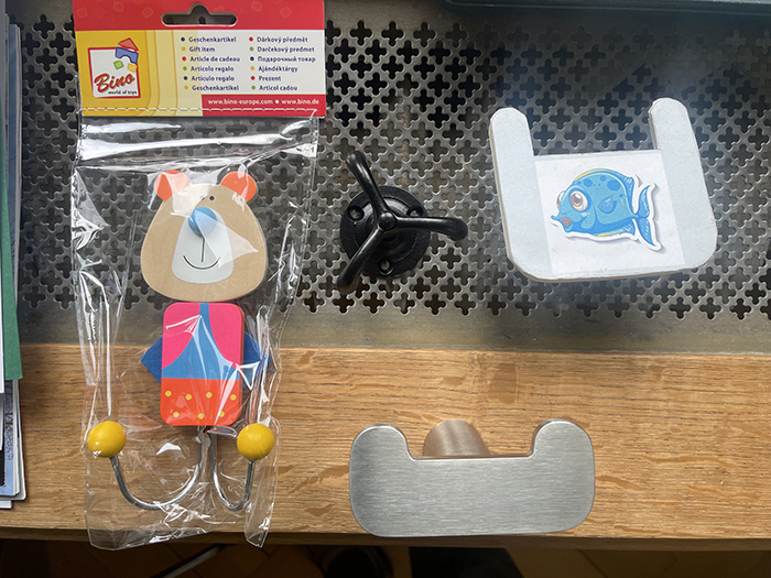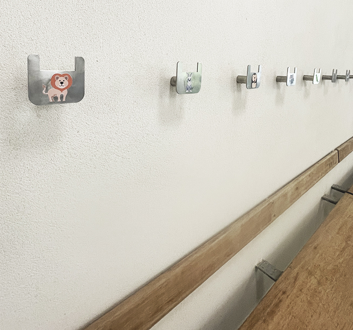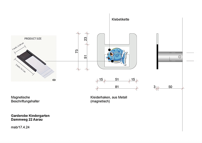 Lässt sich Beschriftung und Kleiderhaken kombinieren? Kein Handelsprodukt erfüllte diese Anforderung, weshalb wir eine eigene „Kollektion für den Kindergarten Dammweg Aarau“ prototypisch entwickelten. Eine Firma aus dem Aargau laserte den Haken anhand unseren Vektordaten, ein lokaler Schlosser machte die Befestigungsrohre und das Einmessen mit Montage übernahmen wir im Rahmen unserer Bauleitung.