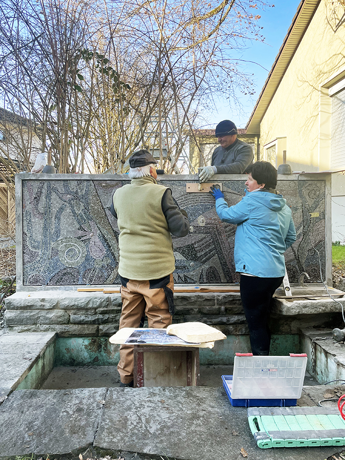 Heute wurde das 3-teilige Wandbild am Orginalstandort nach der Restaurierung vom Atelier Josef Ineichen eingebaut. Die Stadt Aarau hatte das Glasmosaik am 21.11.1958 erworben. Es ist ein sehr wichtiges Element in der „Umgebung im Wohngartenstil“. Das Mosaik hatte sehr viele Abplatzungen und es fehlten viele Glasmosaike.